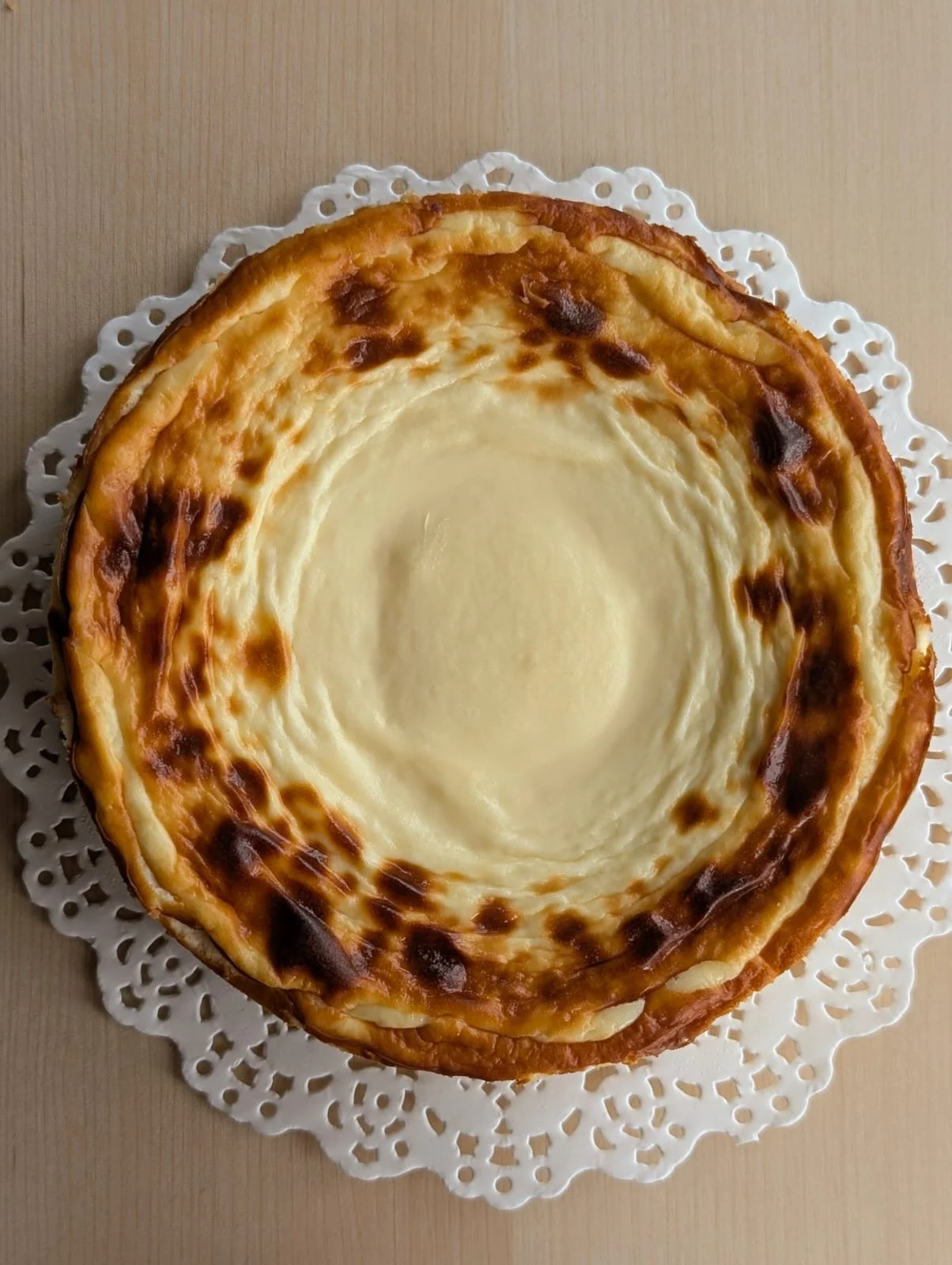A rich, creamy cheesecake with a caramelized, burnt exterior and a soft, velvety interior, inspired by Basque tradition.